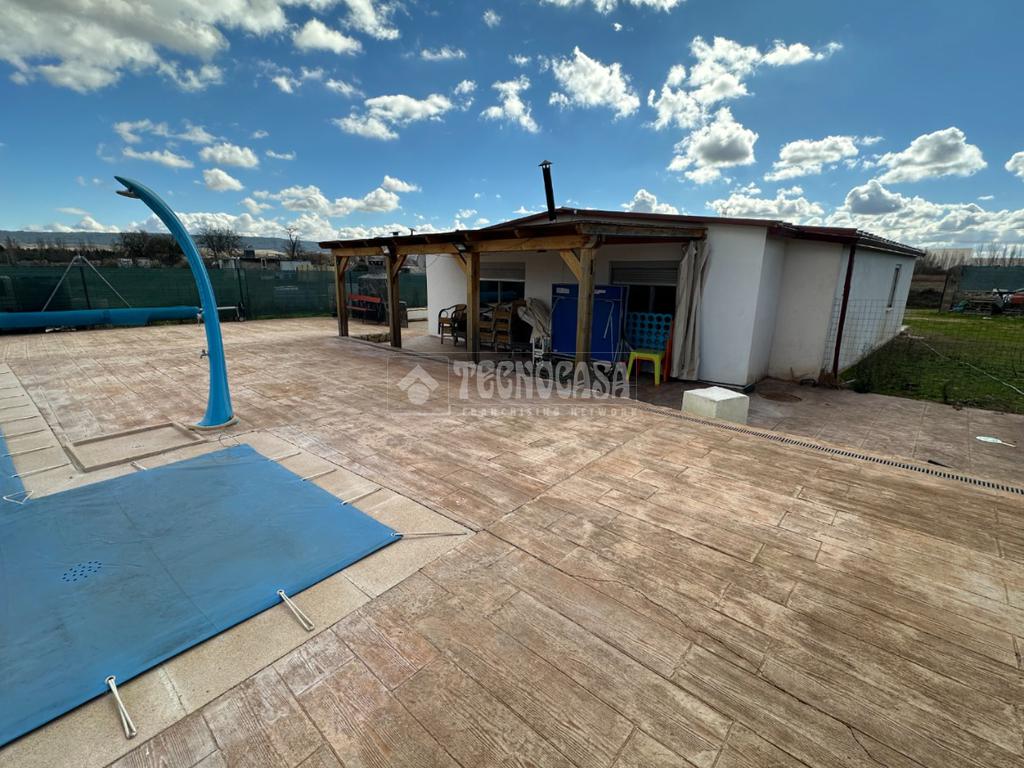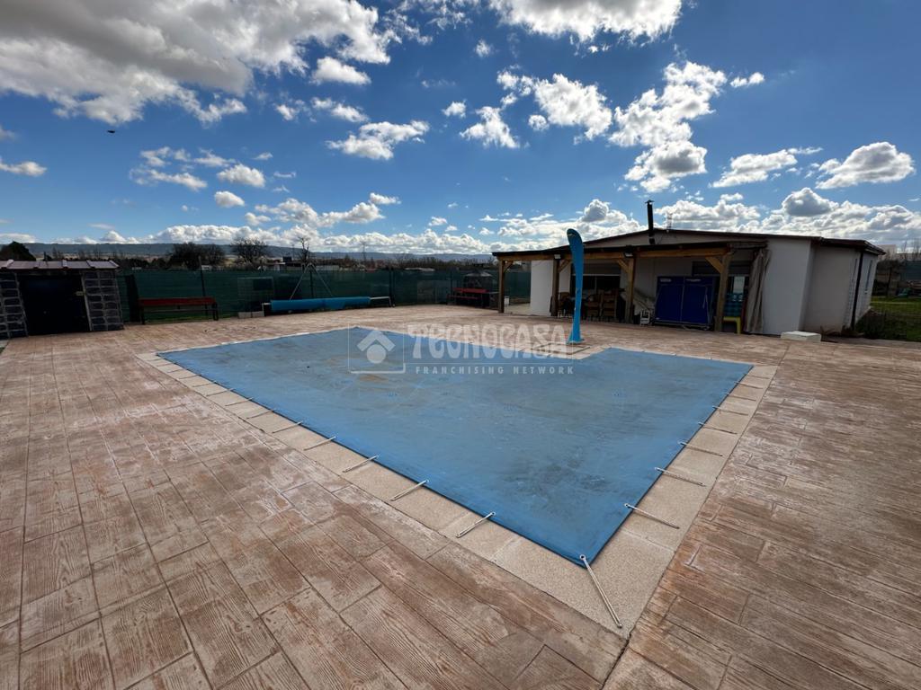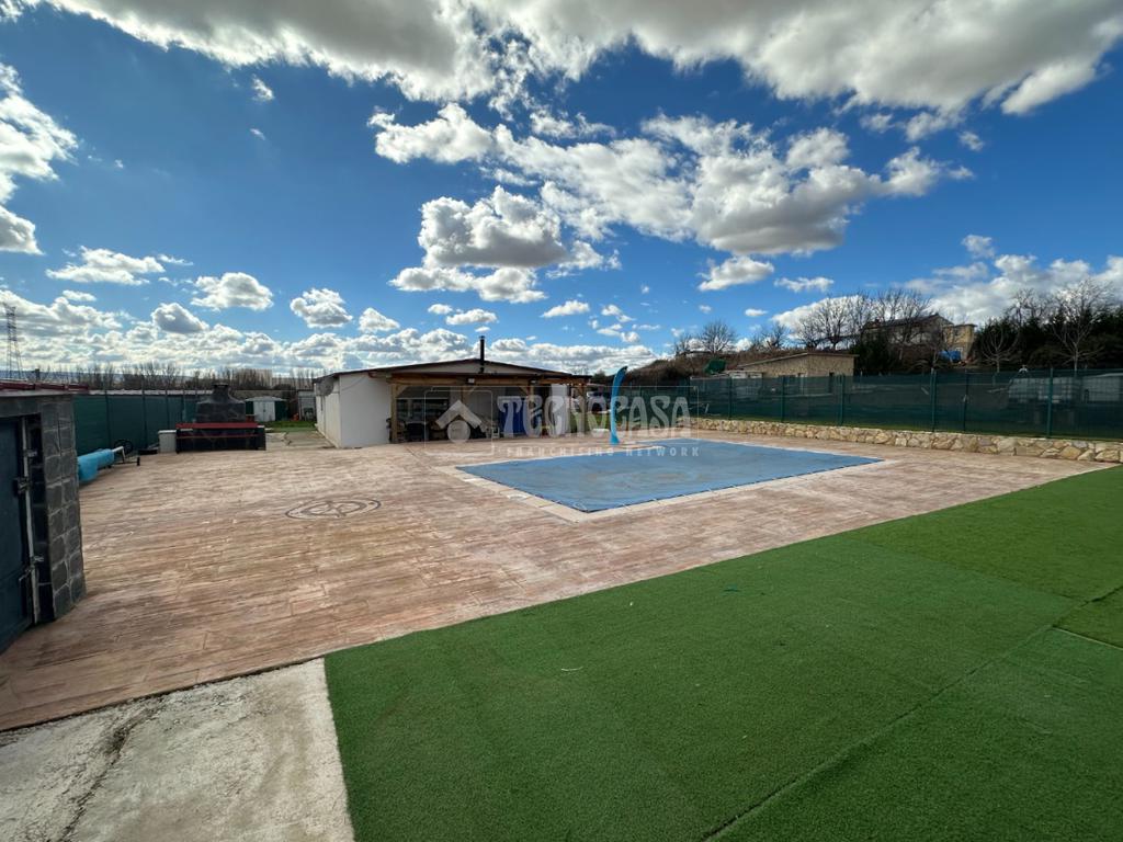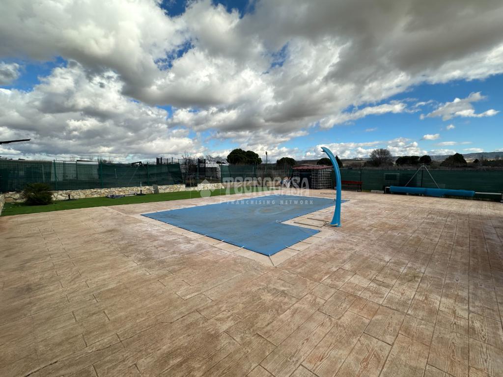 Cuenta con un bonito jardín con barbacoa, porche y patio solado de hormigón impreso con una bonita y exclusiva piscina de obra de 8x4 metros.