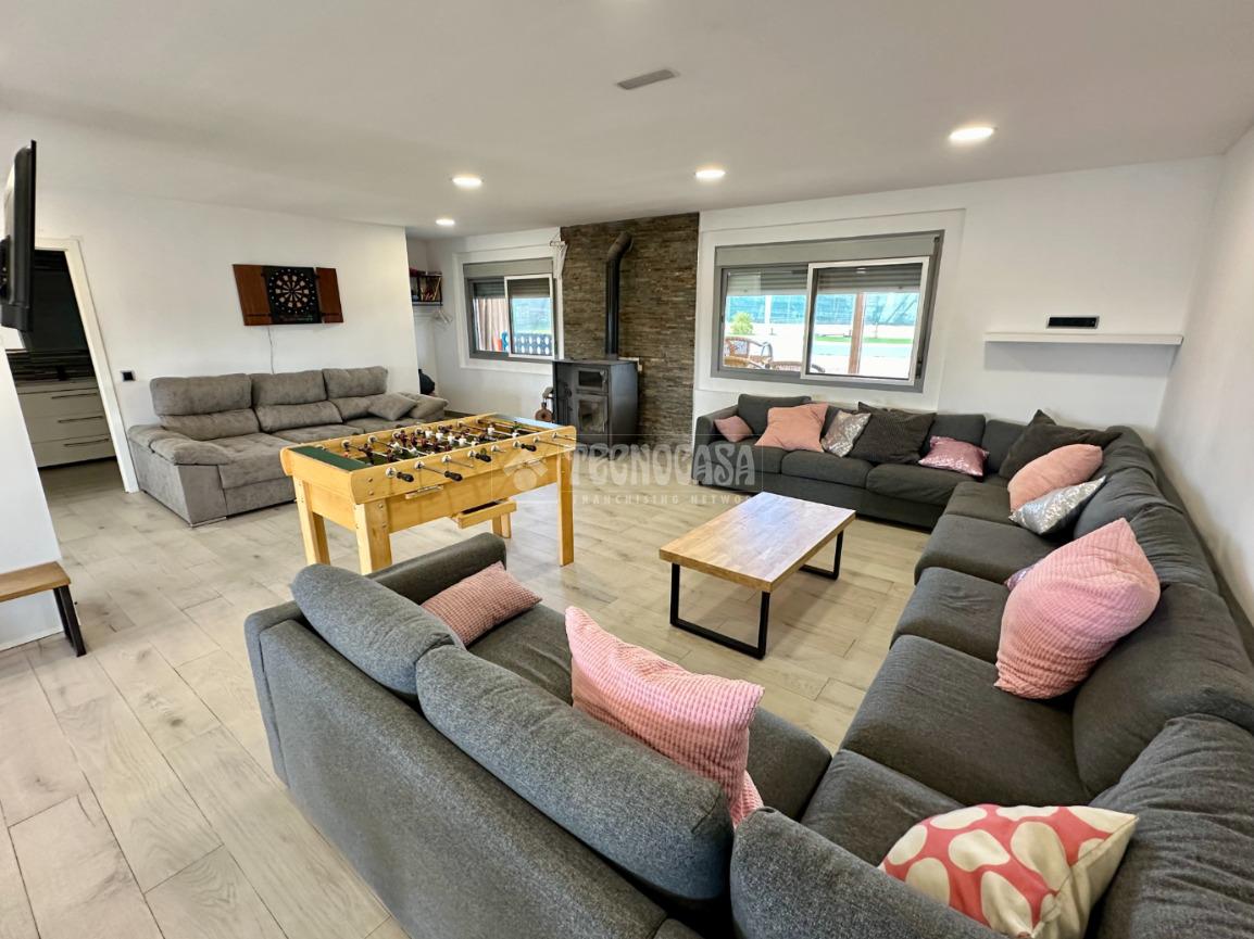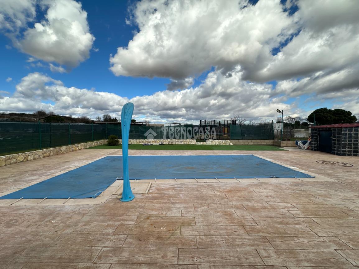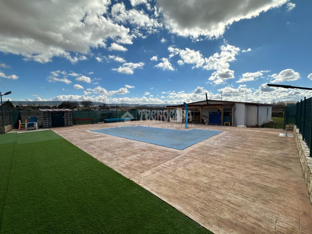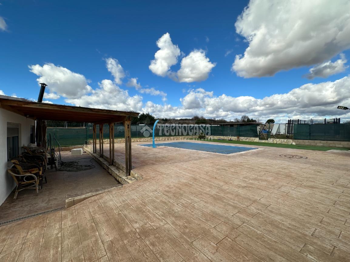 Cuenta con un bonito jardín con barbacoa, porche y patio solado de hormigón impreso con una bonita y exclusiva piscina de obra de 8x4 metros.